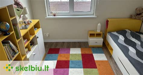 Šiuo atveju dviejų kambarių bute gyvena iš karto keturi žmonės, o tai dar labiau apsunkina baldų pasirinkimą ir jų išdėliojimą. Iki tam tikro gyvenimo momento vaikams pakanka dviejų aukštų lovos. Jei durys į kambarį yra siauresnėje kambario pusėje, iš abiejų pusių nuo durų statykite pagal užsakymą pagamintas spintas su antresolėmis.