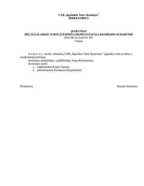 | Įsakymas dėl Ilgalaikio Turto Komisijos | Dokumentas, kuriuo įsakoma sudaryti komisiją ilgalaikiam turtui įvertinti, nurašyti ir kt. |