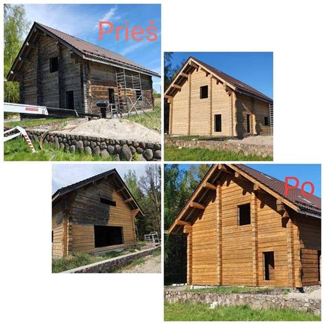 - Dėmių pašalinimas: Jei ant rąstų yra pilkų dėmių ar papilkėjimų, juos galite išnaikinti specialiomis priemonėmis.