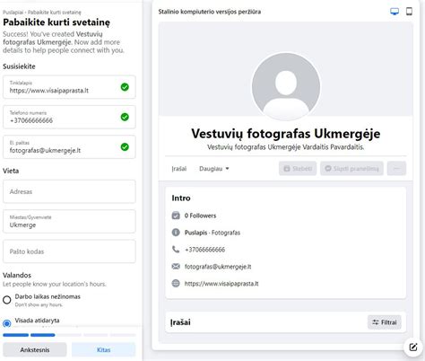 Čia galite bet kada pakeisti visą savo puslapio informaciją. Pirmas laukelis - Jūsų puslapio pavadinimas. Toliau ir vėl matome savo aprašymą, kurį galėjome įkelti kuriant puslapį pačioje pradžioje. Žemiau suveskite visus savo kontaktinius duomenis.
