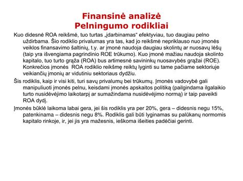 | Nuosavo kapitalo pelningumas (ROE) | Grynasis pelnas / Nuosavas kapitalas | Parodo, kiek efektyviai panaudojamas nuosavas įmonės kapitalas. |