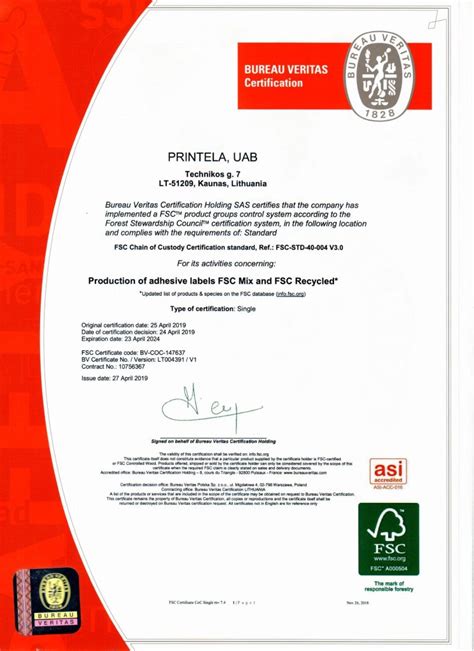 FSC® (angl. Forest Stewardship Council) yra tarptautinė ne pelno siekianti organizacija, padedanti užtikrinti atsakingą miškų valdymą ir tvarkymą. Atlikę užsakymą, sąskaitoje faktūroje matysite tokį įrašą prie konkretaus produkto: FSC® Mix Credit. Sert.nr. BV-COC-173775. Ne. Kad gaminiai buvo pagaminti iš FSC® sertifikuotų medžiagų ir visa grandinė buvo išlaikyta bus nurodyta sąskaitoje faktūroje. Norint turėti FSC® ženklą ant pačių spaudos gaminių, reikia tai susiderinti iš anksto prieš teikiant užsakymą.