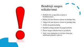 - Asmeninės apsaugos priemonės: Operatoriai turi dėvėti asmenines apsaugos priemones, tokias kaip šalmai ir apsauginiai batai.