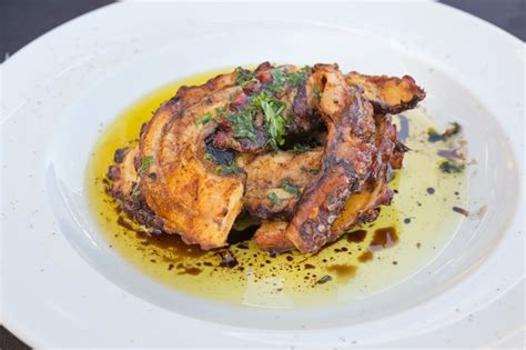 Keptas aštuonkojis su citrinų ir žolelių marinatu.