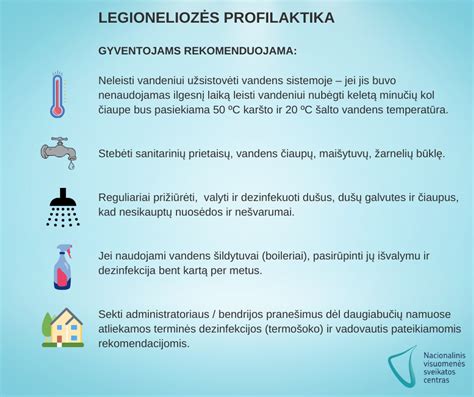 Gyventojams patariama neleisti vandeniui užsistovėti, kad nesikauptų nuosėdos reguliariai valyti dušus, dušų galvutes ir vandens čiaupus. Visus vandens filtrus būtina valyti ir dezinfekuoti kas 1-3 mėnesius. Lietuvos higienos normose HN 24:2003 „Geriamojo vandens saugos ir kokybės reikalavimai” yra reikalavimas dėl saugaus geriamojo vandens tiekimo. Minėtos higienos normos 26.2.