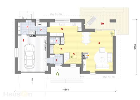 - Kompaktiškas vieno aukšto namas sutapdintu stogu su vienviečiu garažu, darbo kambariu.