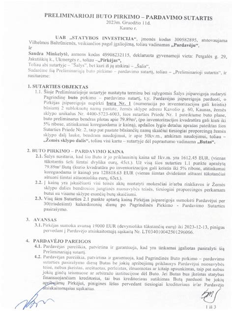 - Sutarties galiojimas: Paprastai preliminarioji sutartis turi terminuotą galiojimą iki Šalių numatytos dienos arba galioja iki notarinės pirkimo-pardavimo sutarties sudarymo momento.