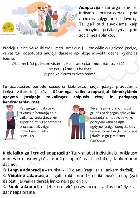 | Koks yra normalus adaptacijos laikotarpis? | Adaptacijos laikotarpis kiekvienam vaikui individualus, tačiau dažniausiai trunka apie pusę metų. |