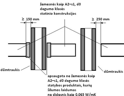 Atstumas nuo dūmtraukio sienelės išorinio paviršiaus iki statinio konstrukcijų, kurių degumo klasė žemesnė kaip A2-s1, d0, ir kitų degių medžiagų (išskyrus ne žemesnės kaip DFL degumo klasės grindų dangas), turi būti ne mažesnis kaip: 200 mm - medienai; 100 mm - kitoms degioms medžiagoms.