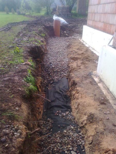 Jeigu naudojama geotekstilė - ant jos užpilamas žvyro sluoksnis (5-10 cm storio). Ant žvyro klojami perforuoti drenažiniai vamzdžiai (gofruoti arba lygiasieniai). Rekomenduojamas atstumas nuo pamato sienos iki vamzdžio - 20-30 cm.