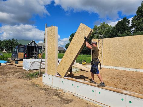 6 m ilgio sieną gali montuoti trys žmonės. Naudojantis laikinais ryšiais, išdėtytais statmenai ir išilgai sienai, yra fiksuojama jos padėtis gulsčiuku ir virve. Tokiu būdu sumontuojamos visos namo sienos, ir, įsitikinus, kad jų padėtis teisinga, tarpusavyje sutvirtinamos vinimis.