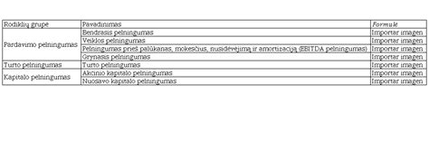 Šioje lentelėje pateikiami pagrindiniai finansiniai rodikliai ir jų formulės: