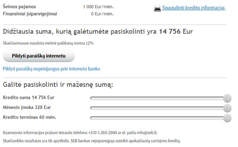 Tai galite lengvai patikrinti naudodamiesi vartojimo paskolos skaičiuokle. Įveskite norimą paskolos sumą, nurodytas terminas preliminariai paskaičiuos mėnesinę įmoką. Norėdami sužinoti tikslią įmoką, užpildykite paraišką vos per keletą minučių. Kiekvienam klientui palūkanos nustatomos individualiai. Jei jūsų finansinė situacija stabili, galite tikėtis, kad bus taikomos mažos kredito palūkanos, kurios išliks fiksuotos visą sutarties laikotarpį.
